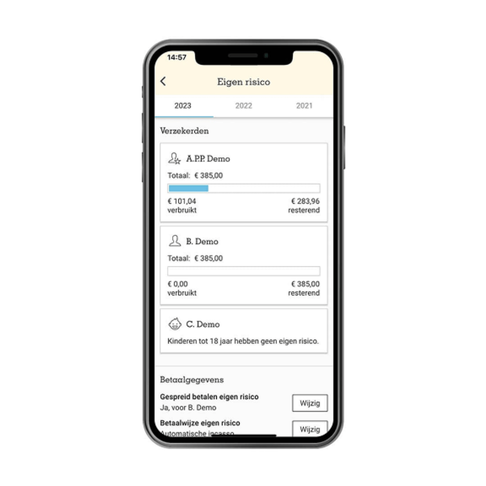 In de app zie je hoeveel eigen risico je dit jaar hebt verbruikt. Ook zie je de stand van andere jaren dat je bij ons verzekerd was.