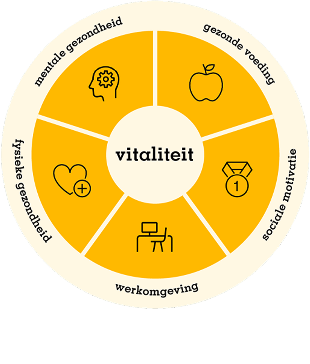 Werkgevers vinden het vaak lastig om handen en voeten te geven aan vitaliteit. Waar kun je nou het beste mee beginnen? De behoeftes en verbeterpunten liggen bij elke organisatie ergens anders. Waar bij de een mentale gezondheid een grote rol speelt in het verzuim, is bij de ander gezonde voeding juist de uitdaging. Daarom is het Model van Vitaliteit ontworpen als praktische gids om alle aspecten van vitaliteit te implementeren op de werkvloer. En dat op een volgorde en tempo die bij jouw organisatie en medewerkers past. In het model vind je 5 pijlers: fysieke gezondheid, mentale gezondheid, gezonde voeding, sociale motivatie, werkomgeving en financiële gezondheid. Met welke ga je als eerste aan de slag?